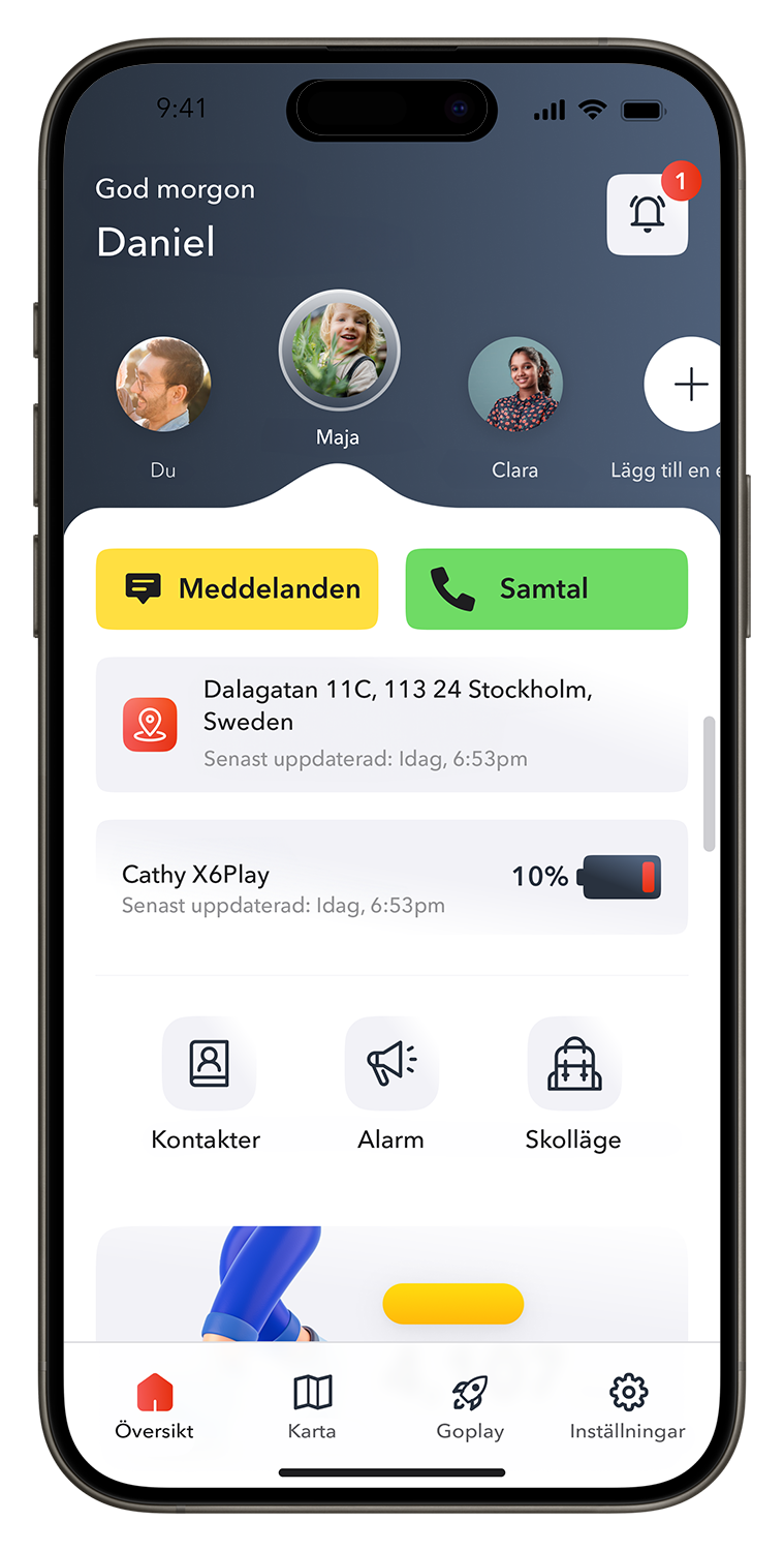 Med appen kan du enkelt hantera kontakter, använda GPS-spårning, ställa in skolläge och mycket mer – direkt från din telefon.